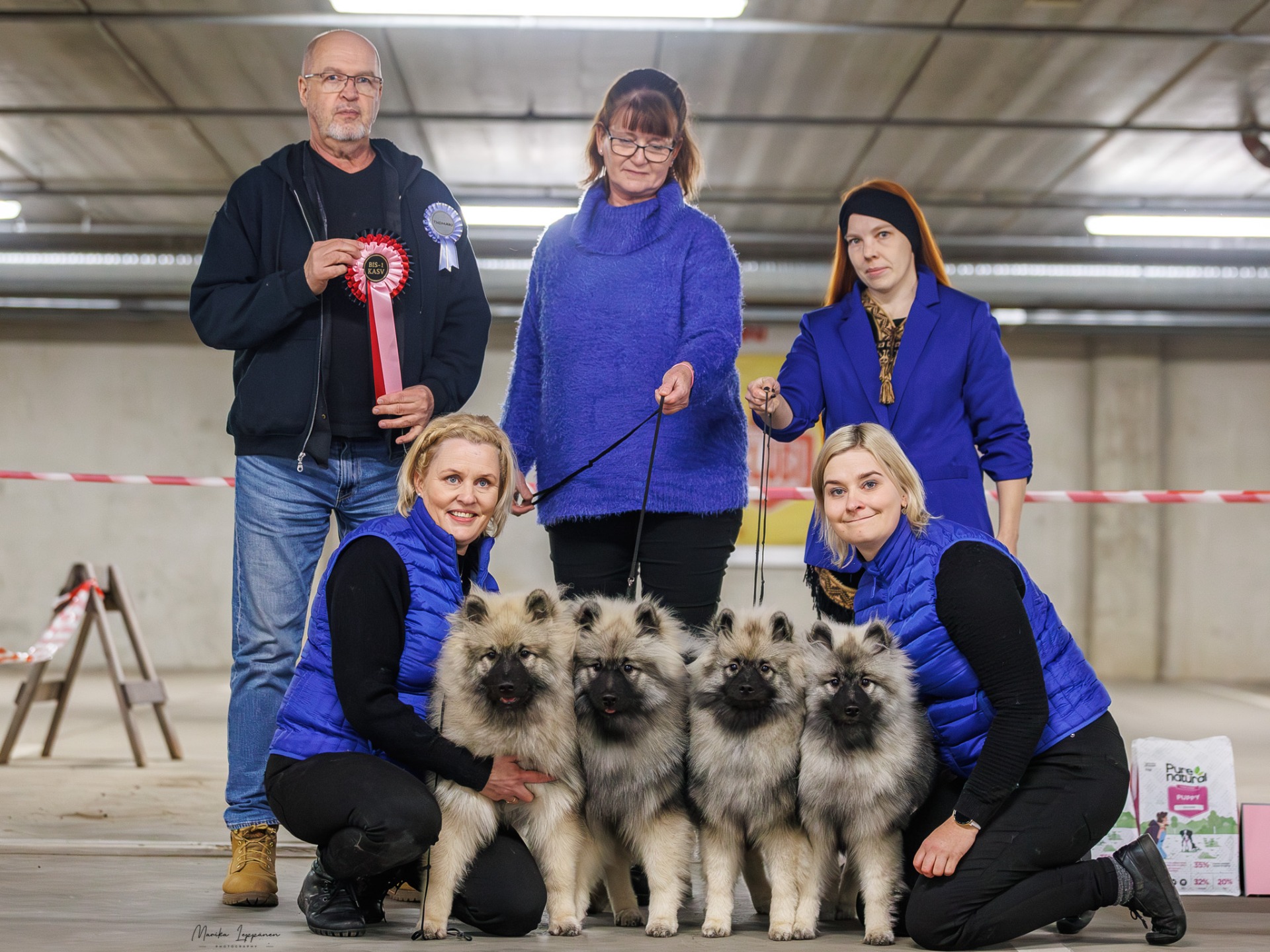 Kolme urosta, yksi narttu, kolme yhdistelmää, upea ryhmä jossa erinomaiset sukupuoli leima, tyypilliset värivaihtelut ja kettumaiset ilmeet, erinomaiset turkin laadut ja hännän kiinnitykset, tasapainoiset rodulle tyypilliset liikkeet, onnittelut rodulle tehdystä työstä.